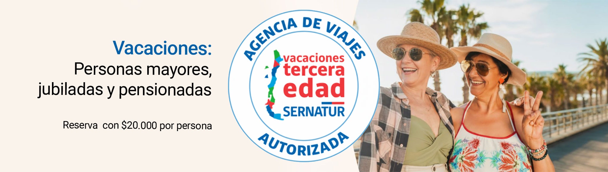 Comercializado a adultos mayores a través de agencias de viaje participantes del Programa Vacaciones Tercera Edad.